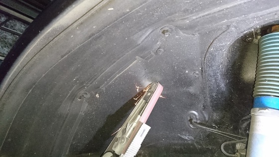 ポンチを打ってから4mmのドリルで上側のボルトに届くくらいの穴を開けておき、その後ドリルを7mmに換えてやってその穴を広げてやれば、そのままボルトは取れてしまいます。 |
